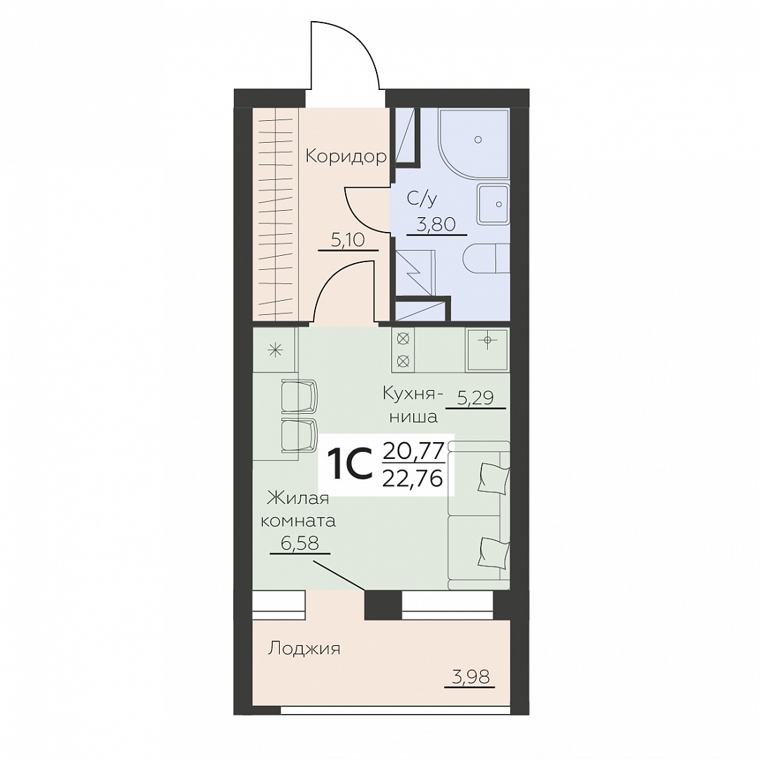 1-комнатная (студия), 22.76 м2, 8 этаж, №631, Заря