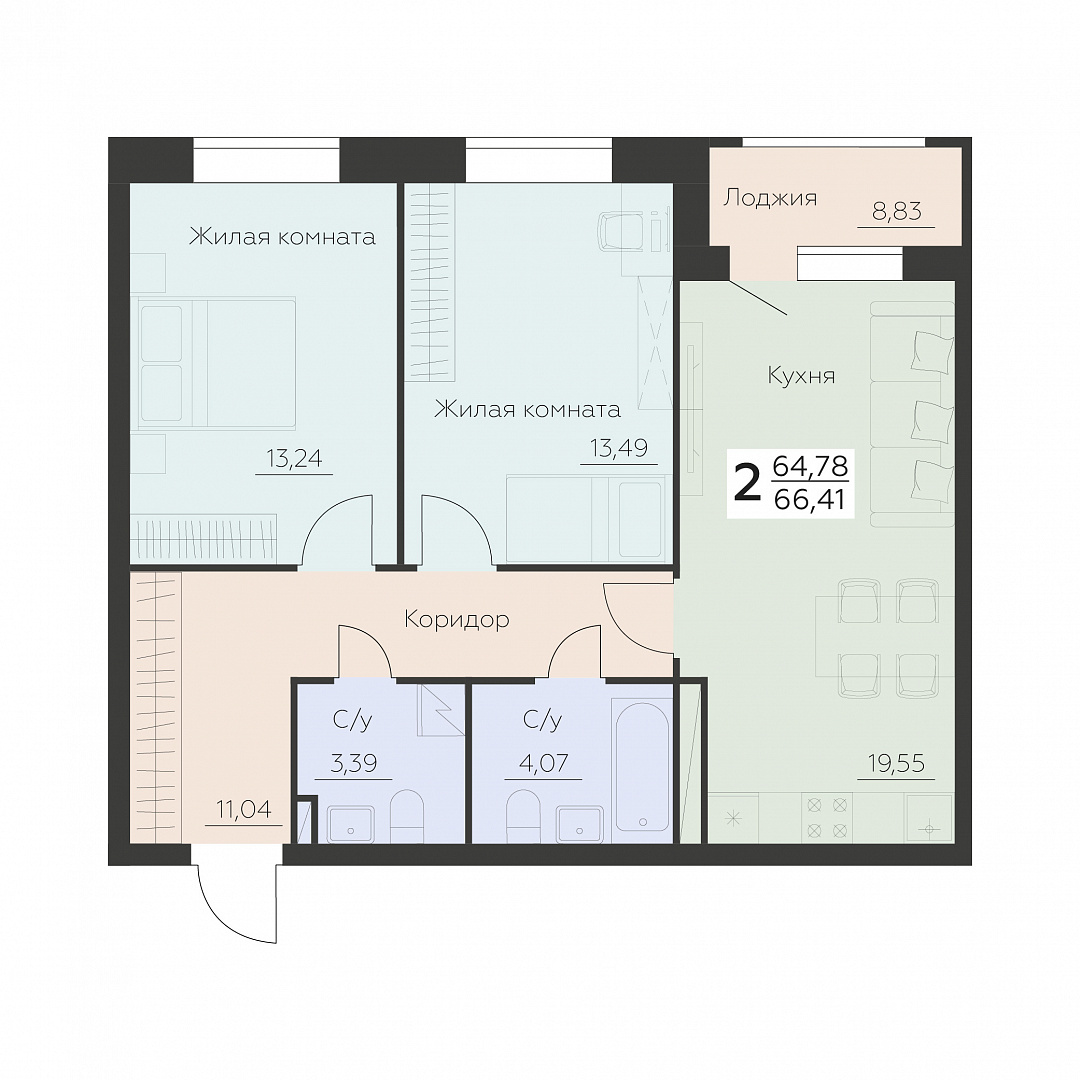 2-комнатная квартира, 66.41 м2, 6 этаж, №536, Заря