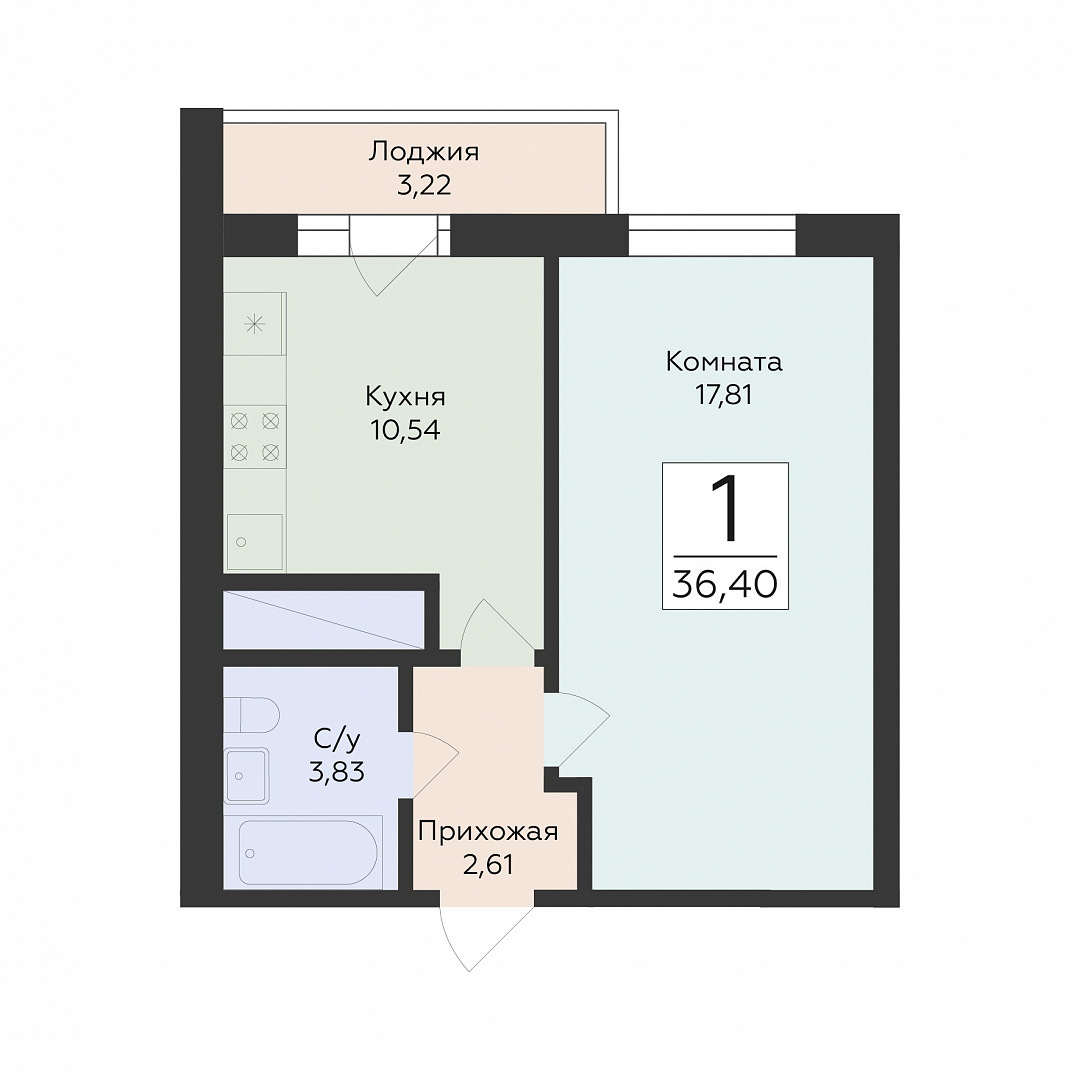 1-комнатная квартира, 36.4 м2, 9 этаж, №426, Юность