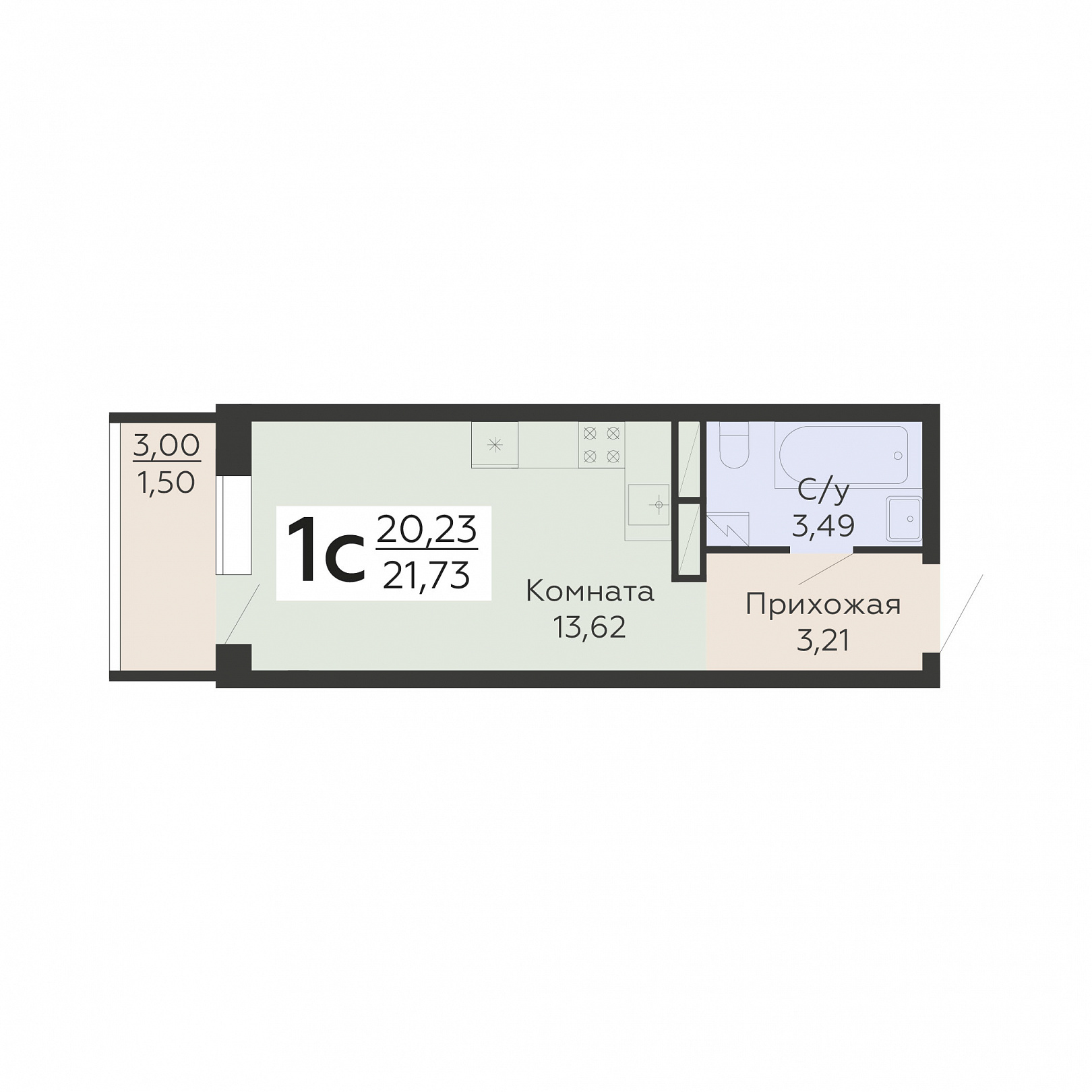 1-комнатная (студия), 21.73 м2, 8 этаж, №660, Никитинские сады