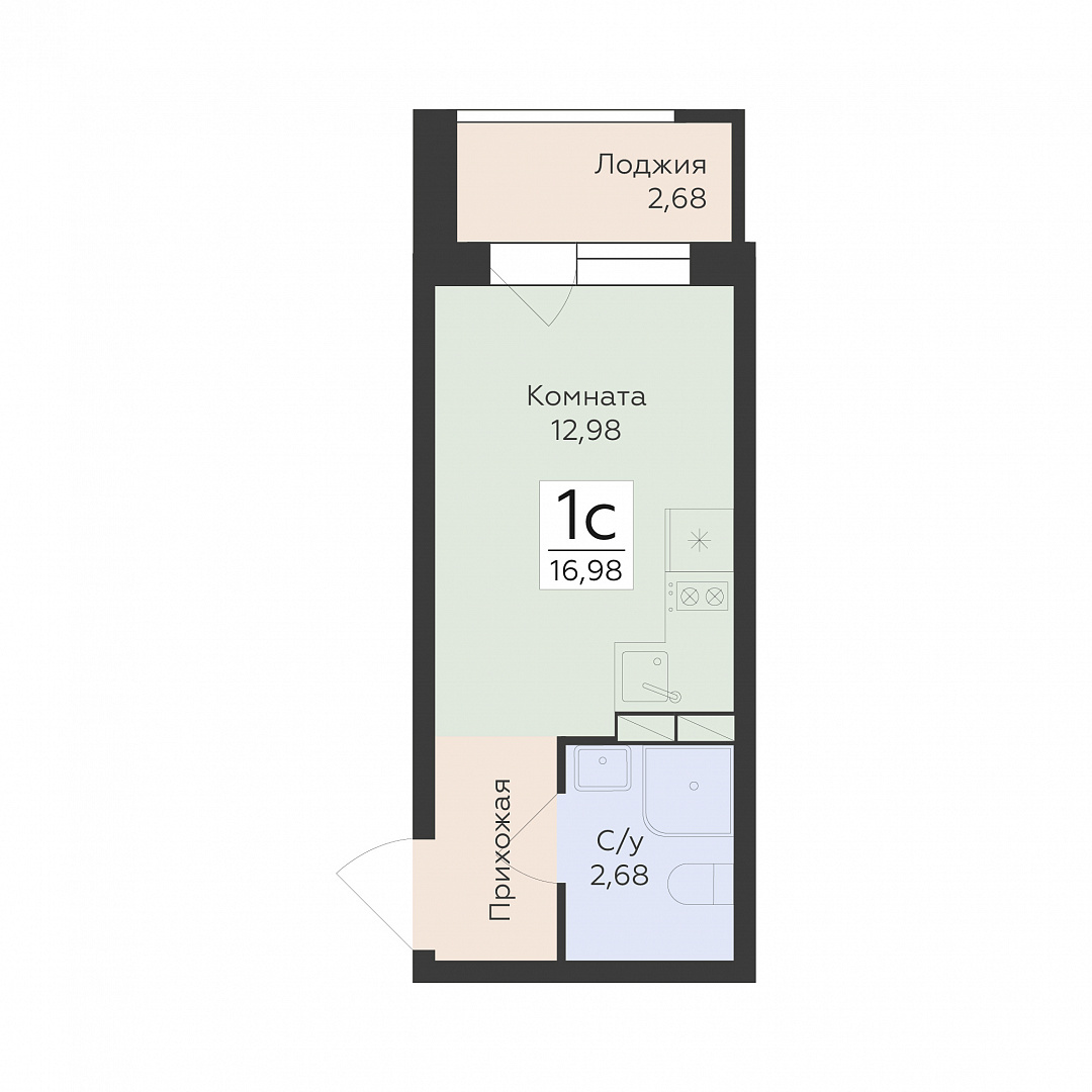 1-комнатная (студия), 16.98 м2, 4 этаж, №641, Flora