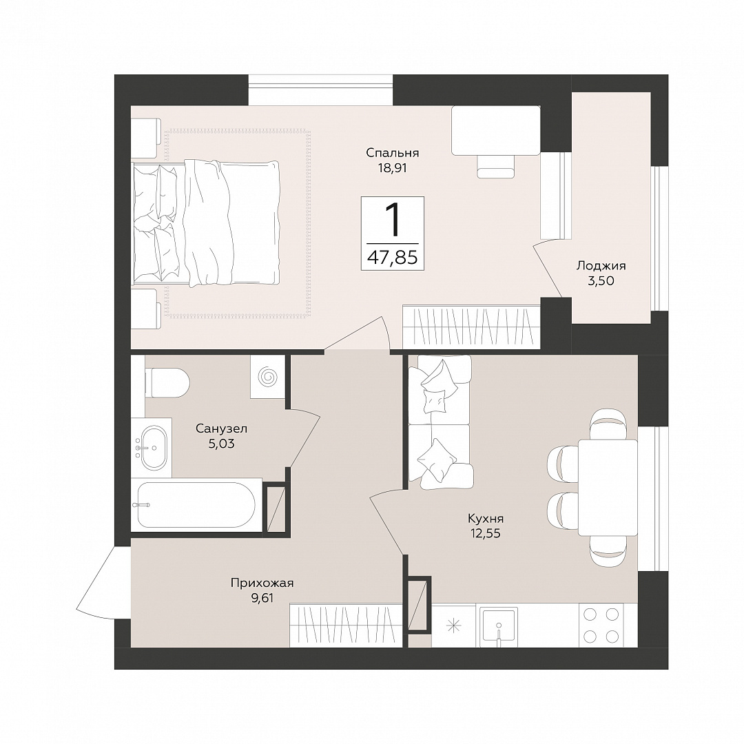 1-комнатная квартира, 47.85 м2, 6 этаж, №138, Эклипс