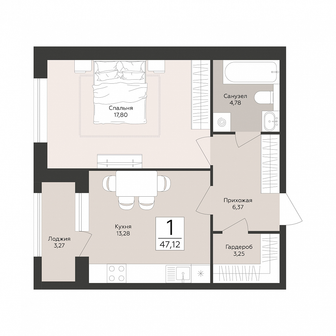 1-комнатная квартира, 47.12 м2, 1 этаж, №4, Эклипс