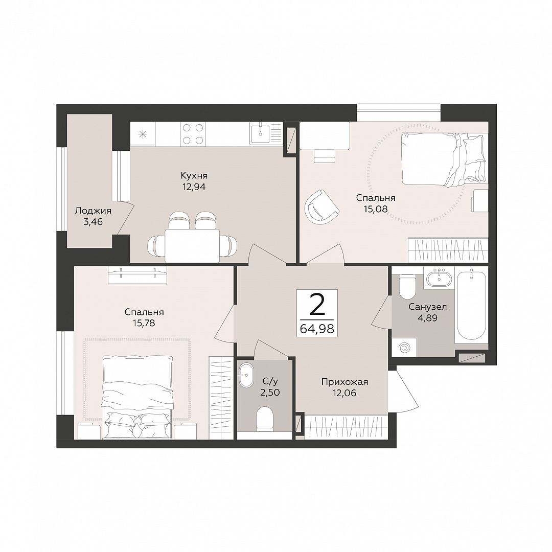2-комнатная квартира, 64.98 м2, 5 этаж, №132, Эклипс