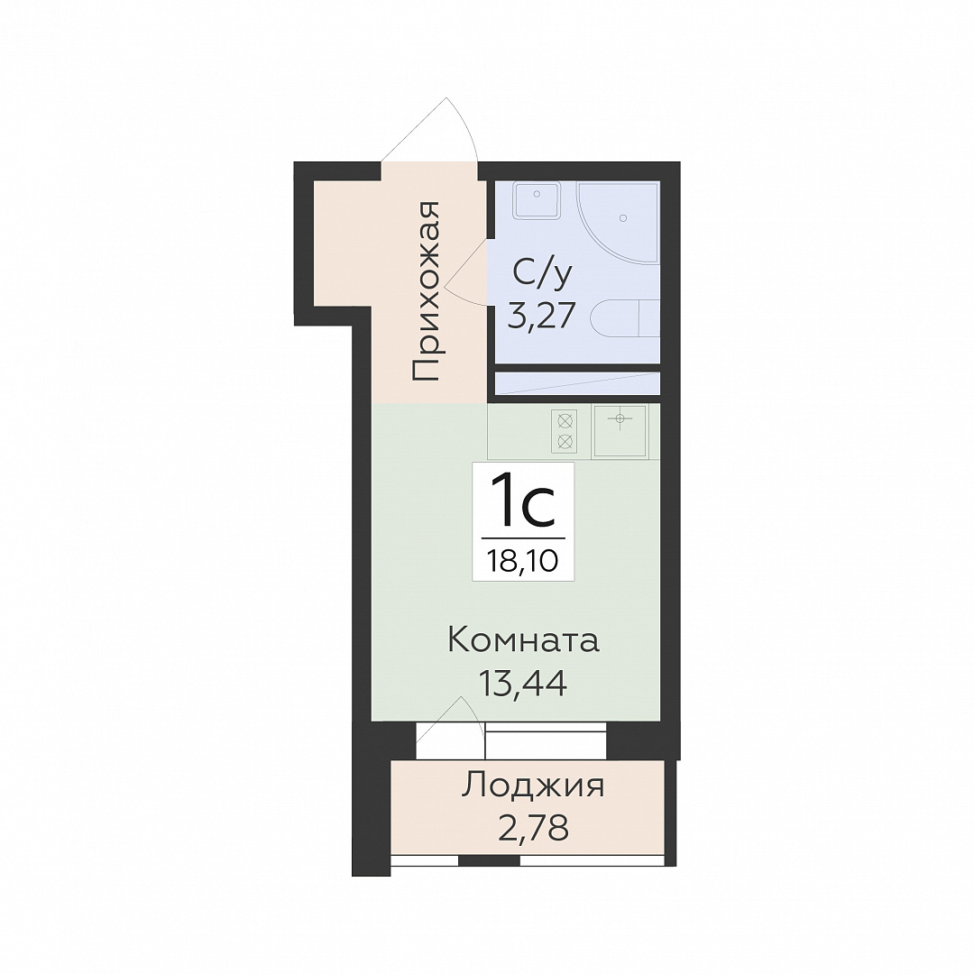1-комнатная (студия), 18.1 м2, 18 этаж, №204, Квартал 45