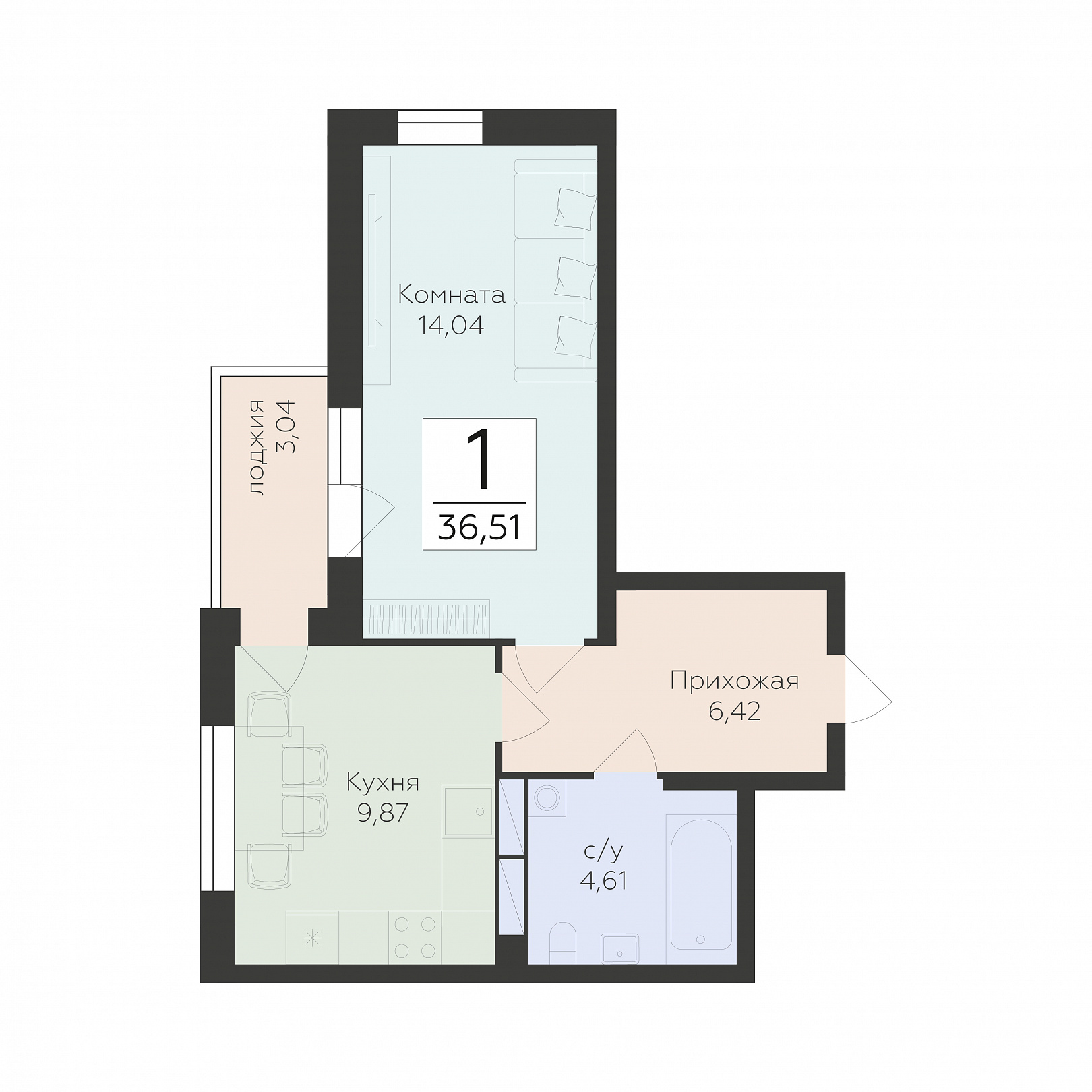 1-комнатная квартира, 36.51 м2, 10 этаж, №221, Авиапарк