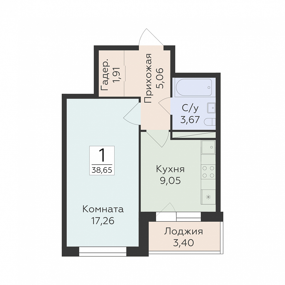 1-комнатная квартира, 38.65 м2, 2 этаж, №217, Авиапарк
