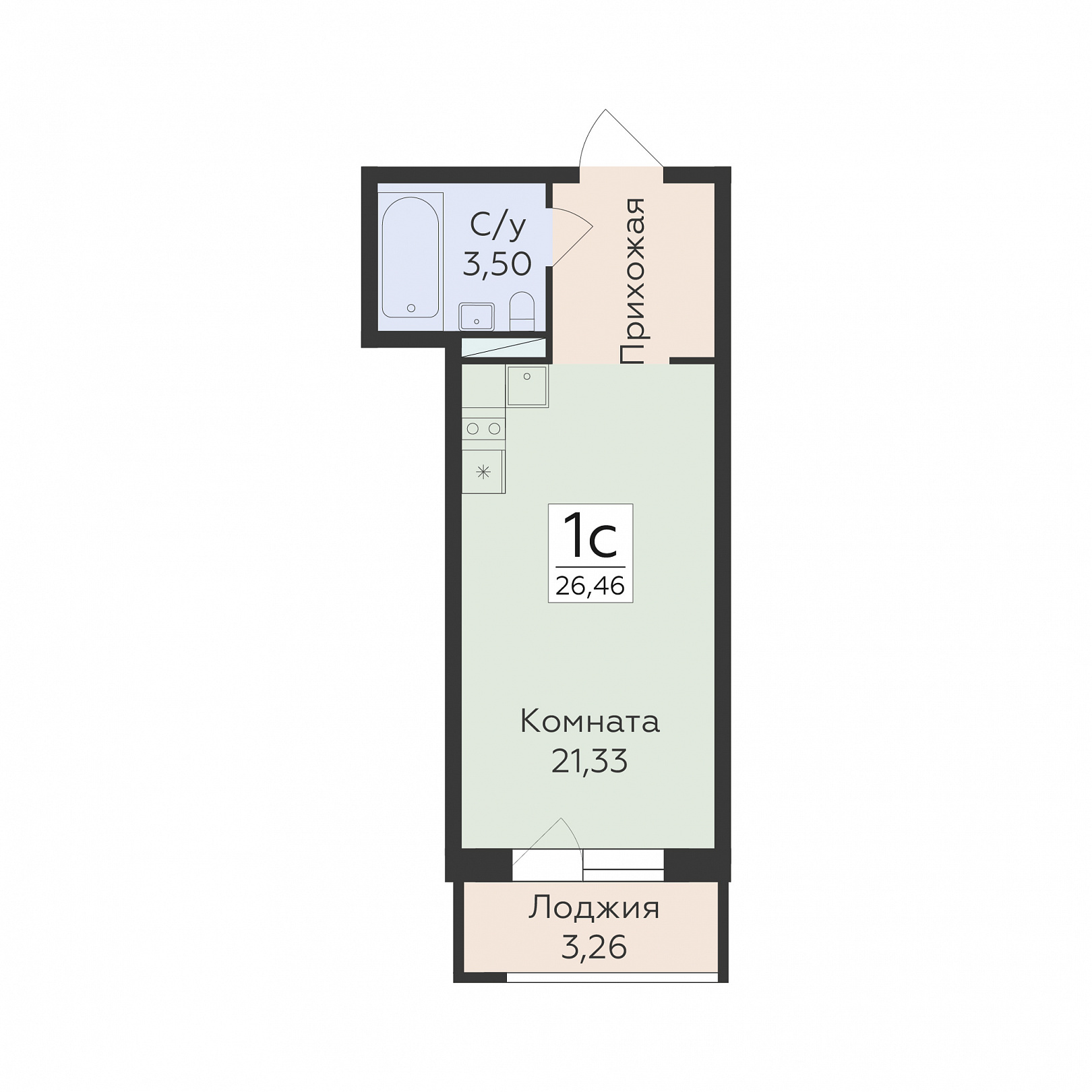 1-комнатная (студия), 26.46 м2, 9 этаж, №304, Авиапарк