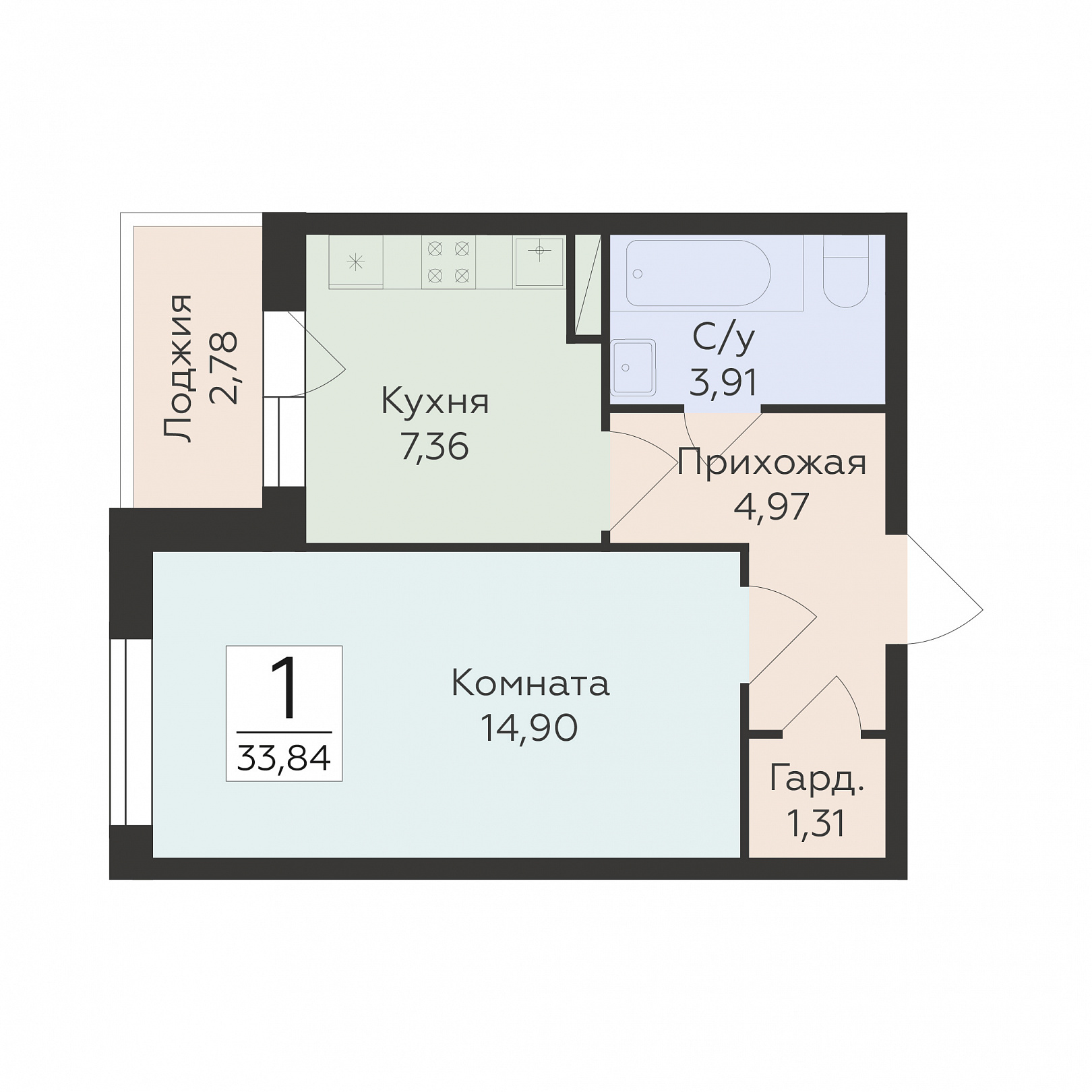 1-комнатная квартира, 33.84 м2, 16 этаж, №188, Авиапарк