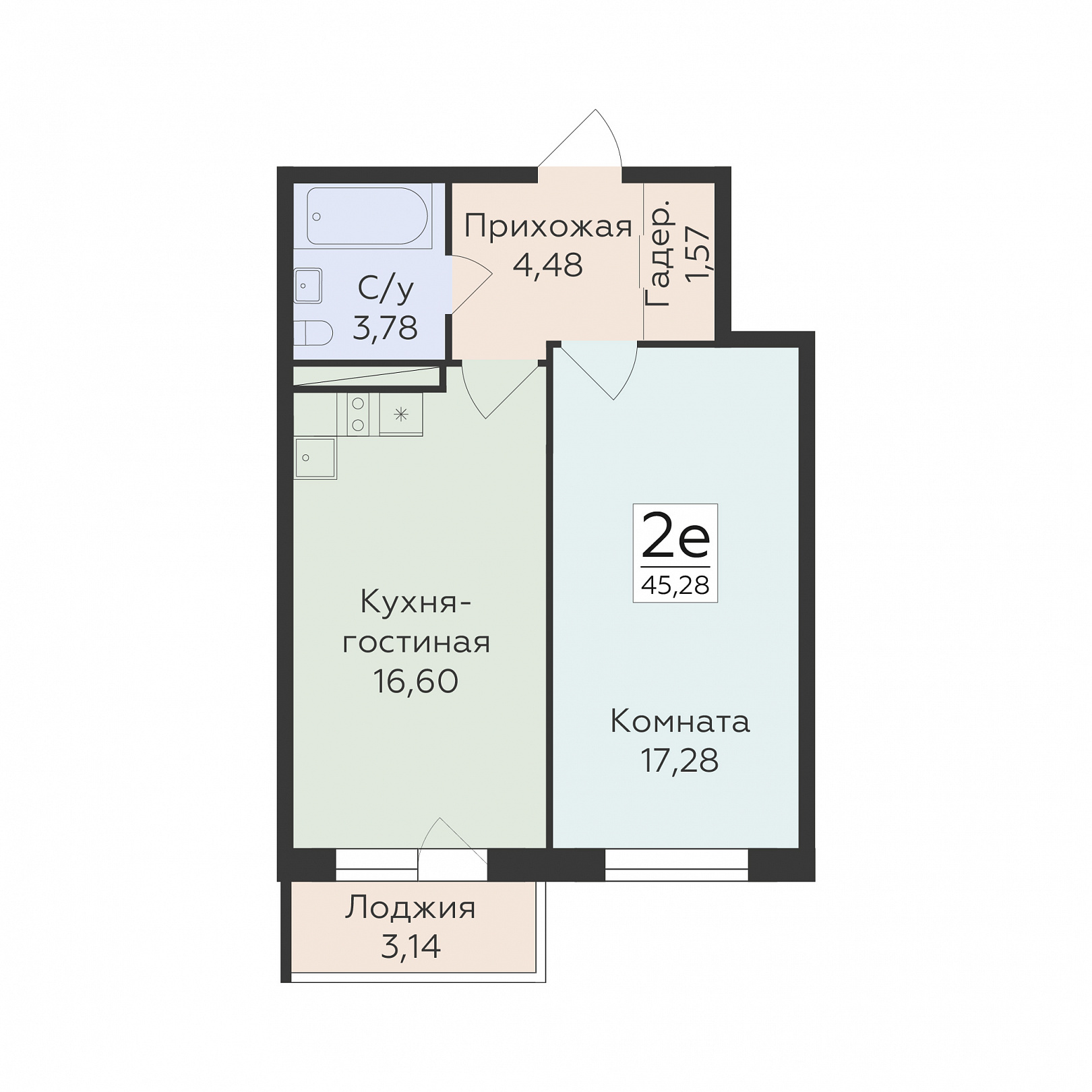 2-ком. квартира (Евро), 45.28 м2, 15 этаж, №377, Авиапарк