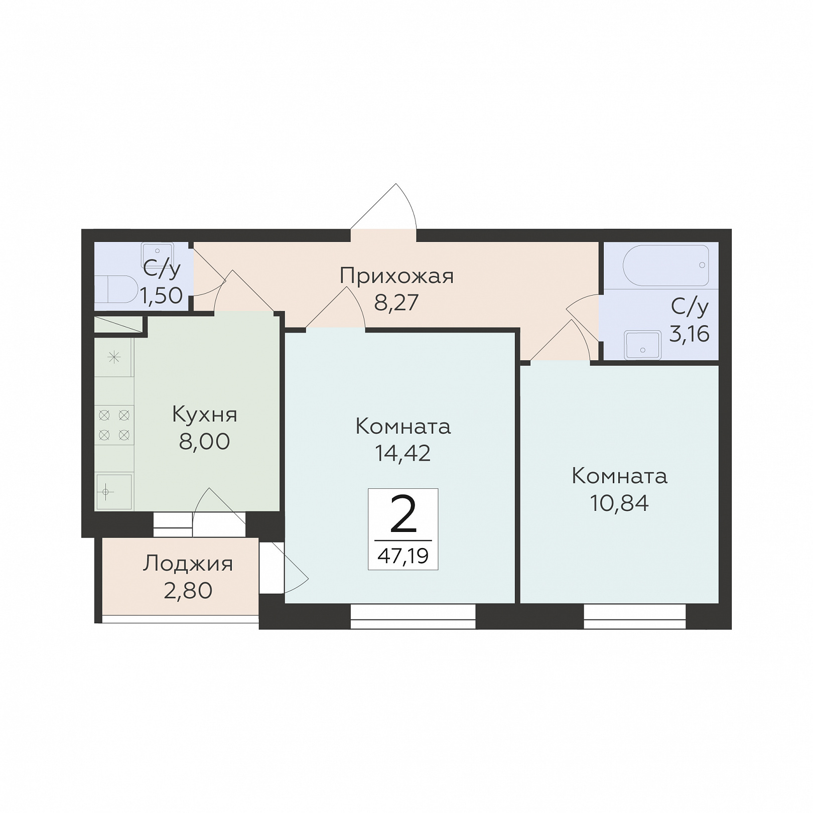 2-комнатная квартира, 47.19 м2, 10 этаж, №111, Авиапарк