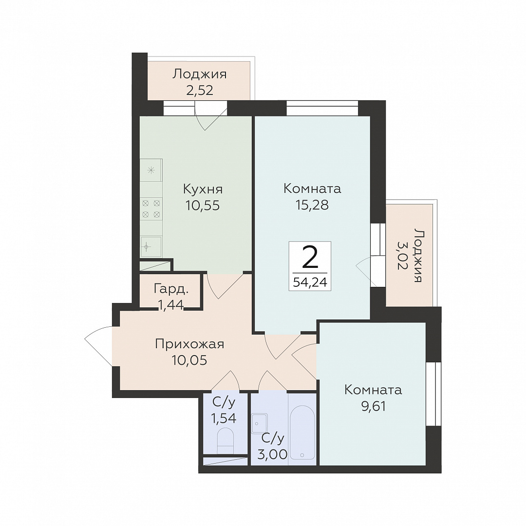 2-комнатная квартира, 54.24 м2, 15 этаж, №169, Авиапарк