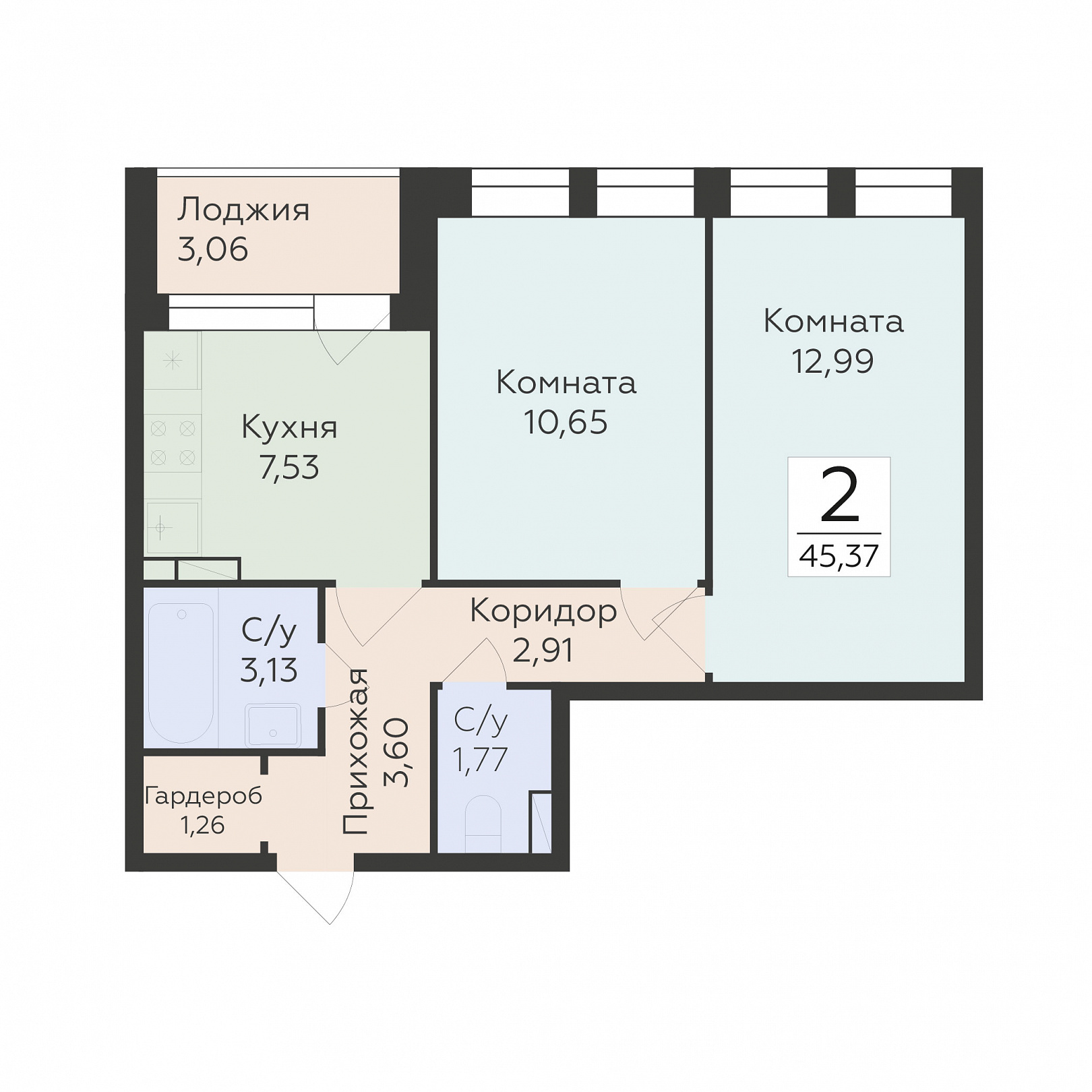 2-комнатная квартира, 45.37 м2, 11 этаж, №1 373, Домино