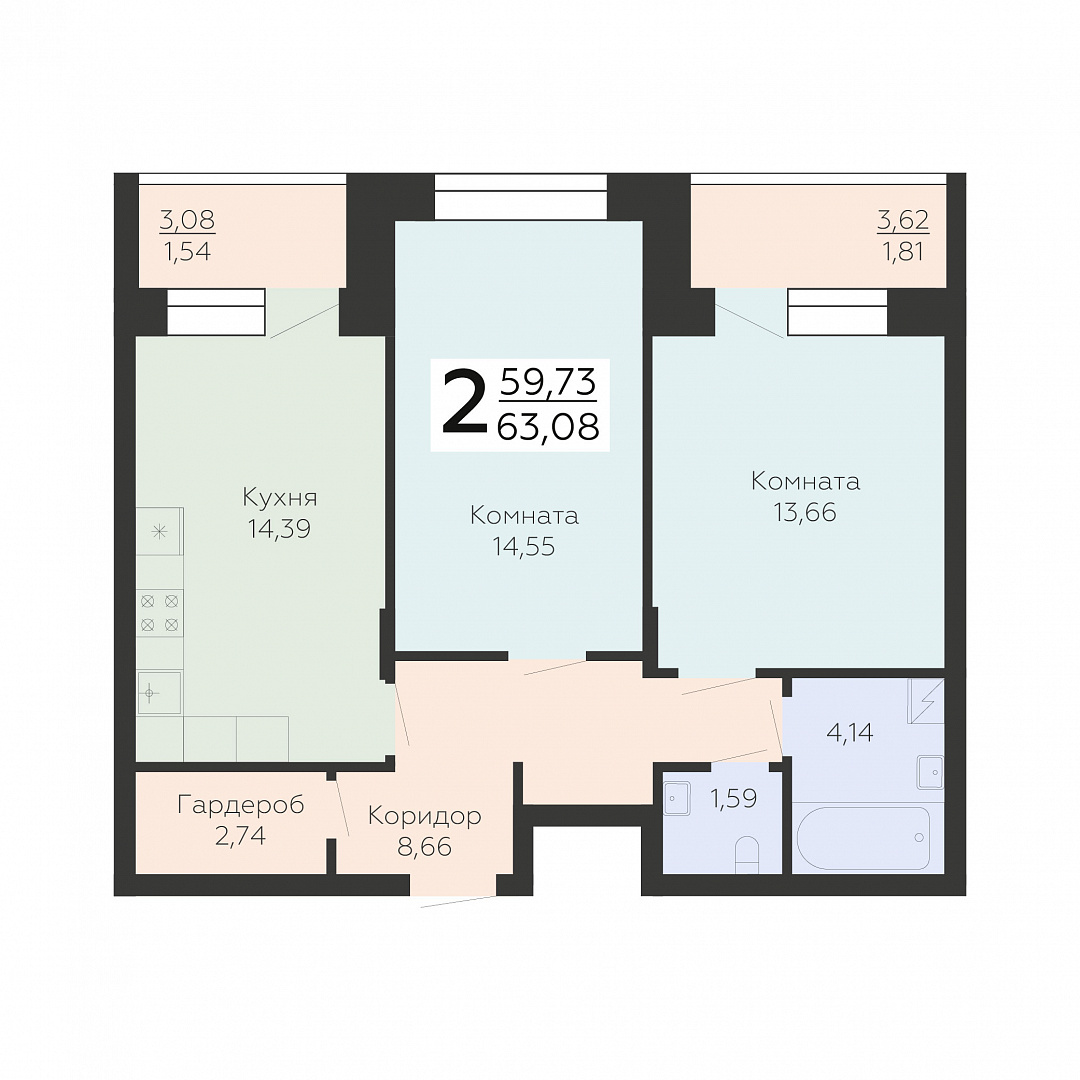2-комнатная квартира, 63.08 м2, 13 этаж, №130, Зарядье