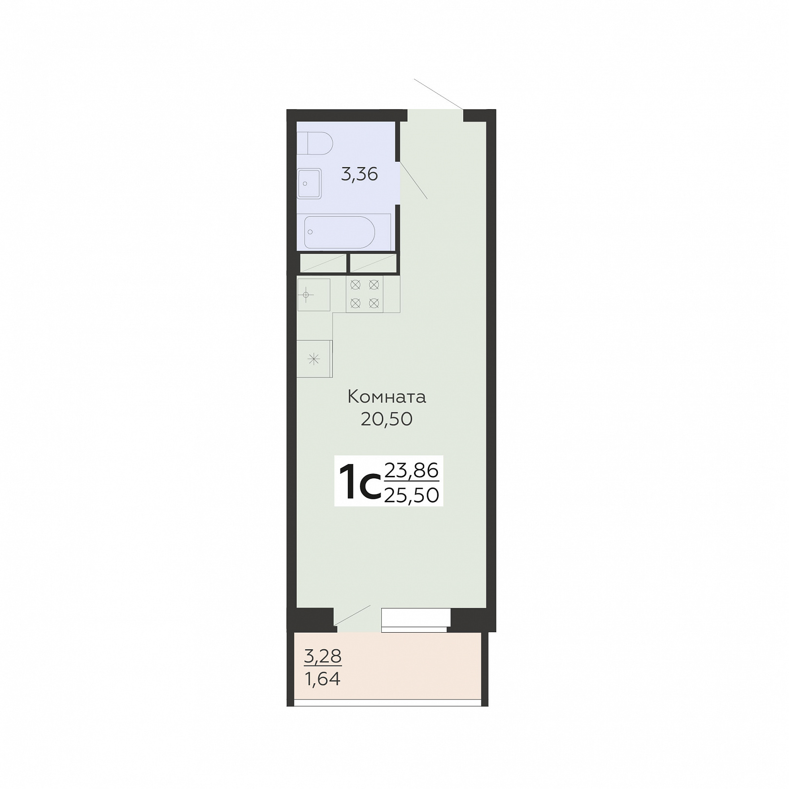 1-комнатная (студия), 25.5 м2, 9 этаж, №90, Авиапарк