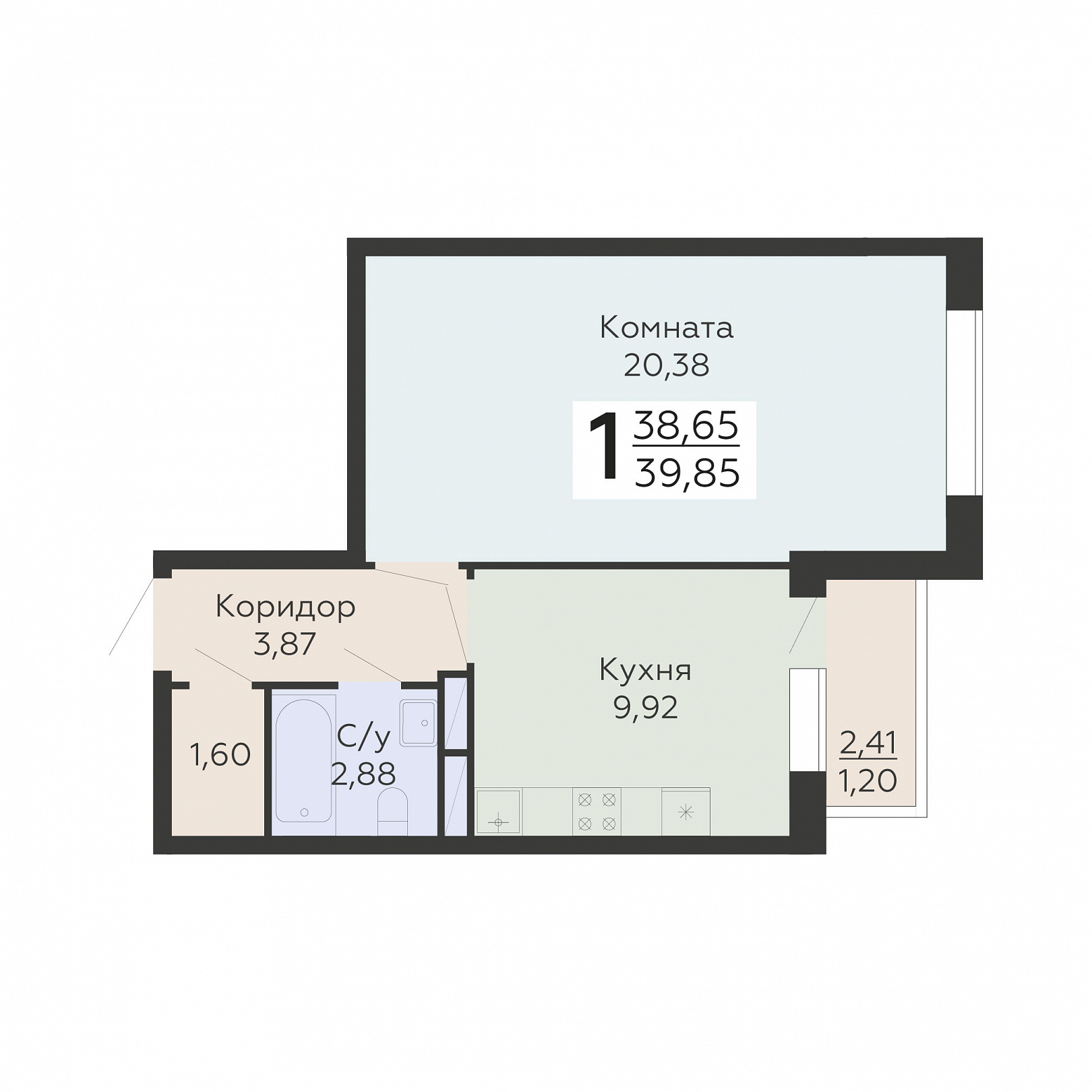 1-комнатная квартира, 39.85 м2, 19 этаж, №257, Никитинские сады
