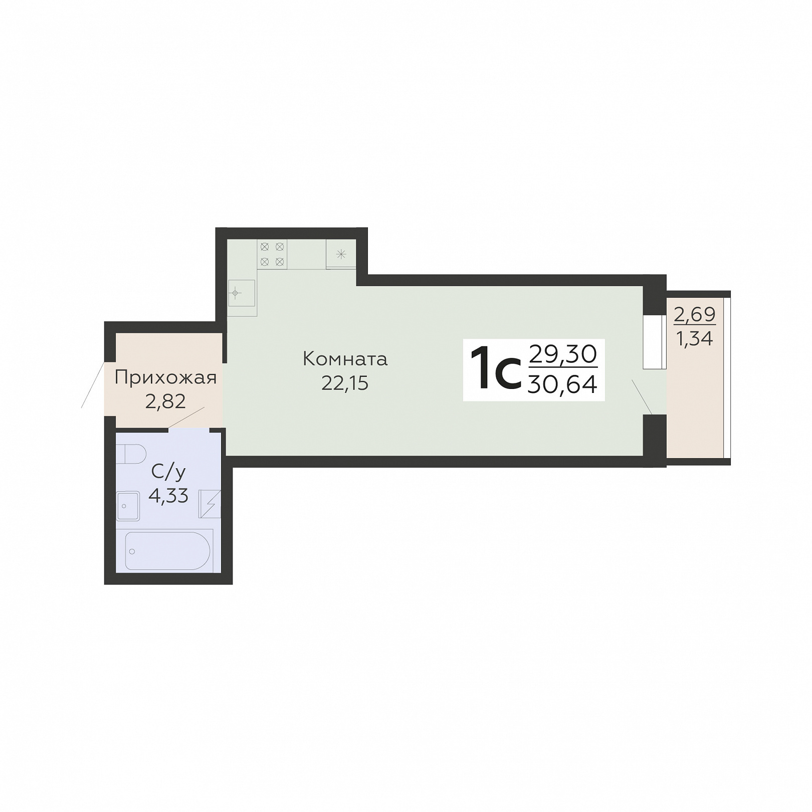 1-комнатная (студия), 30.64 м2, 10 этаж, №408, Никитинские сады
