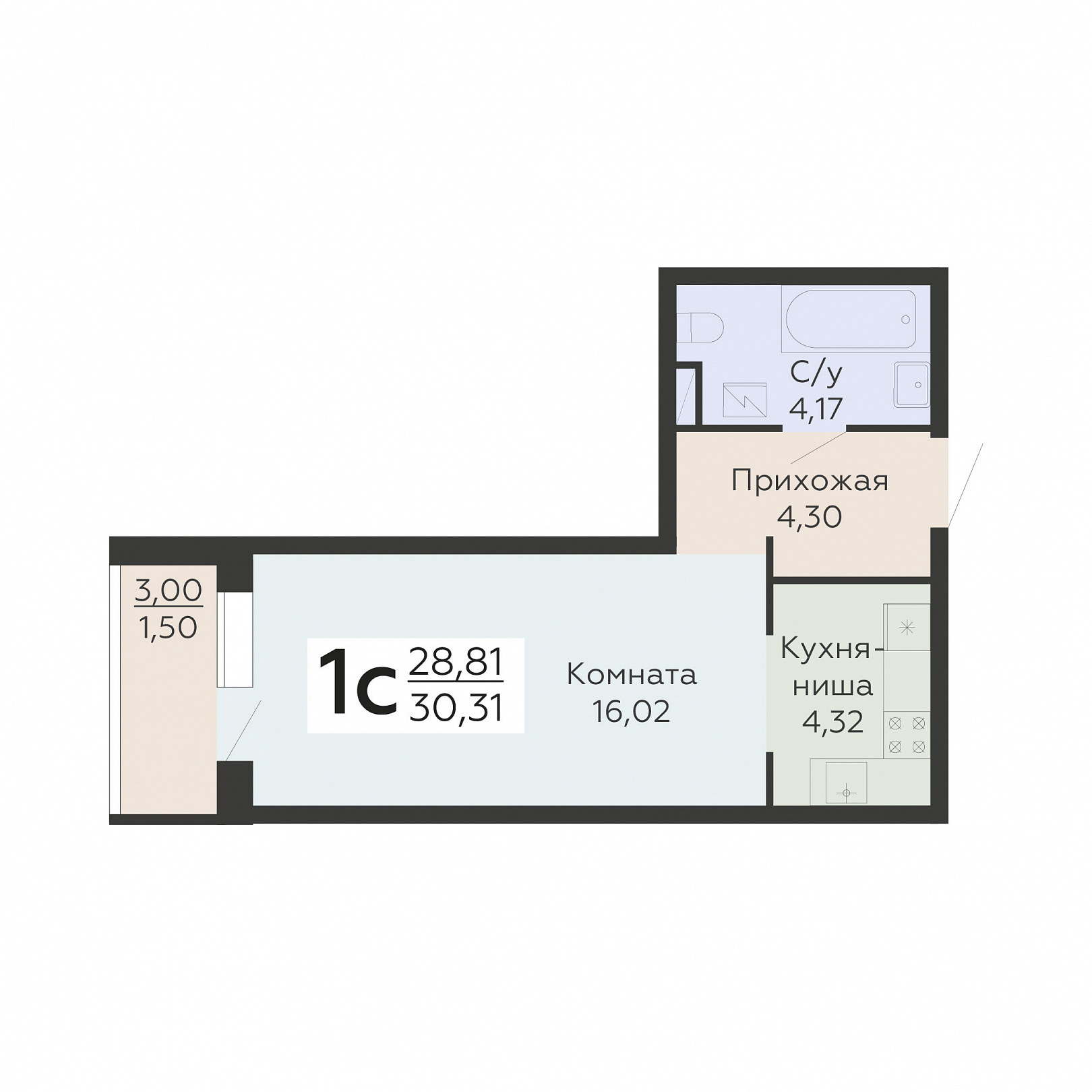 1-комнатная (студия), 30.31 м2, 19 этаж, №550, Никитинские сады