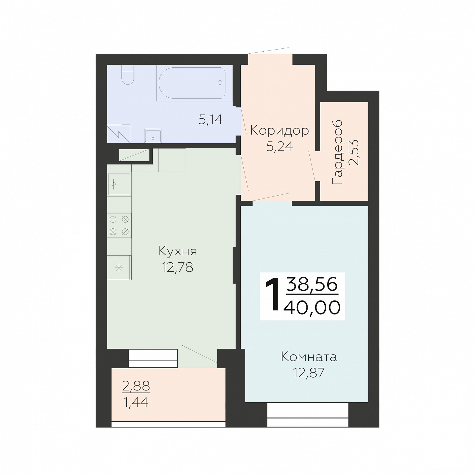 1-комнатная квартира, 40 м2, 17 этаж, №159, Зарядье