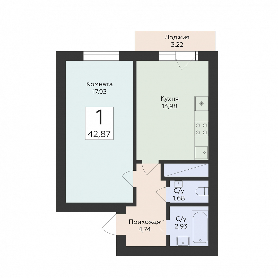 1-комнатная квартира, 42.87 м2, 6 этаж, №400, Юность