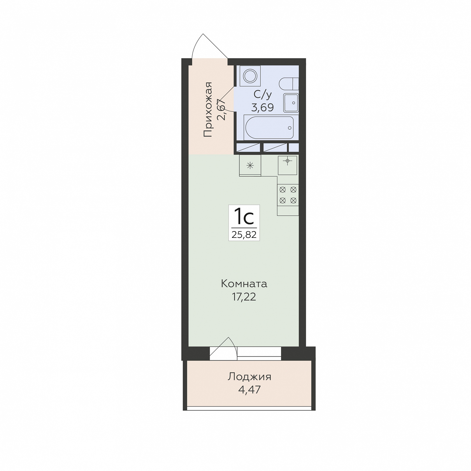 1-комнатная (студия), 25.82 м2, 10 этаж, №83, Flora
