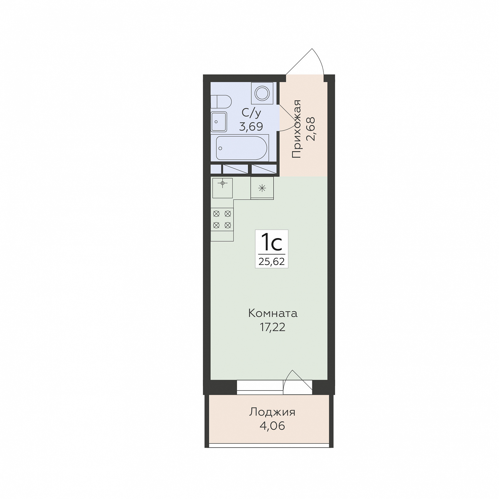 1-комнатная (студия), 25.62 м2, 3 этаж, №14, Flora