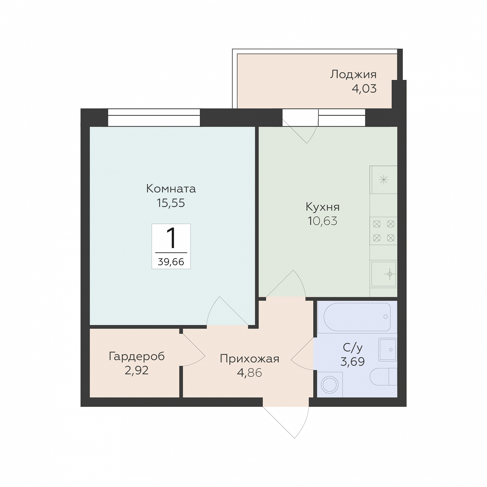1-комнатная квартира, 39.66 м2, 5 этаж, №522, Flora