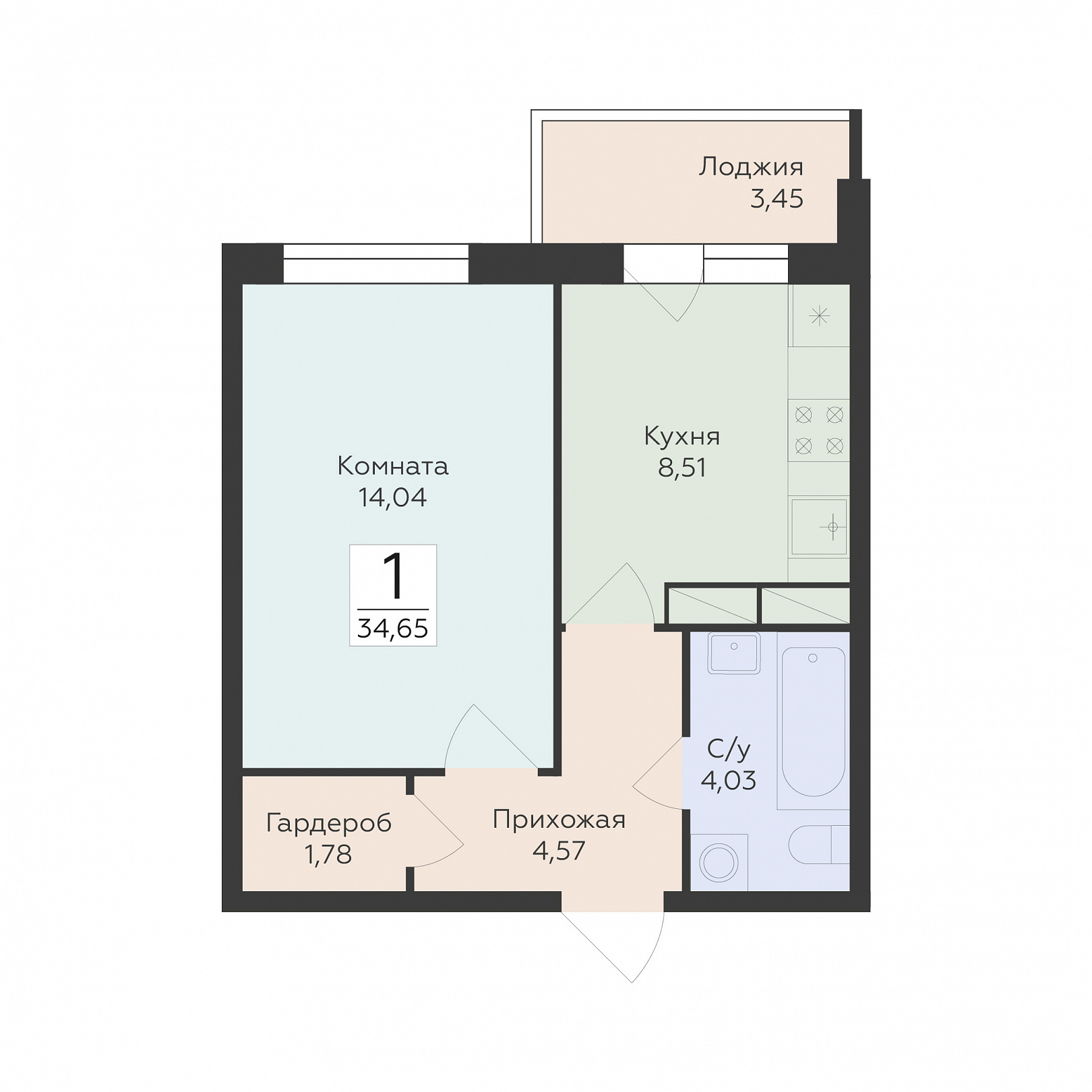 1-комнатная квартира, 34.65 м2, 11 этаж, №709, Flora