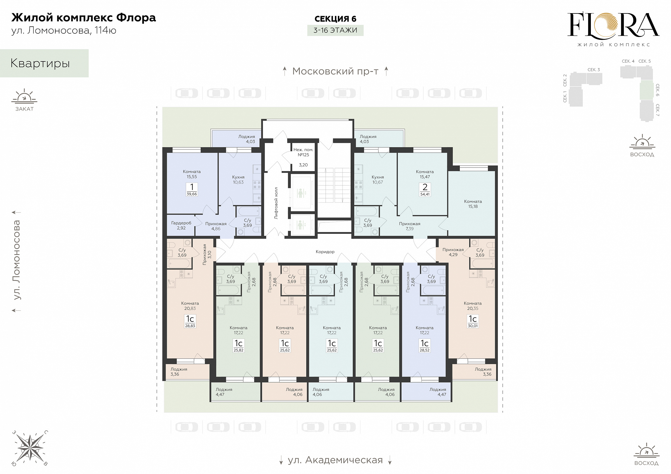 2-комнатная квартира, 54.41 м2, 5 этаж, №514, Flora