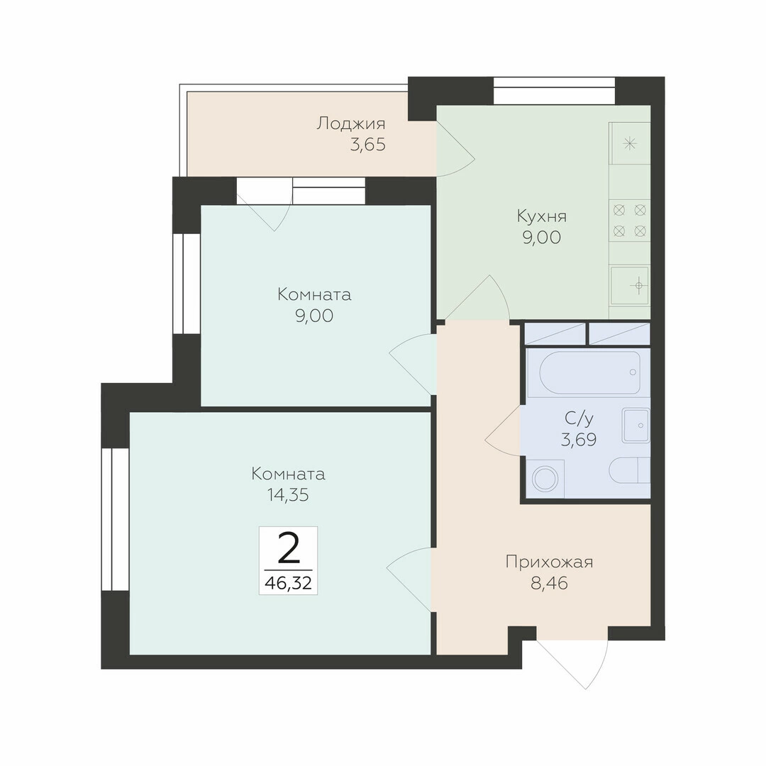 2-комнатная квартира, 46.32 м2, 4 этаж, №168, Flora