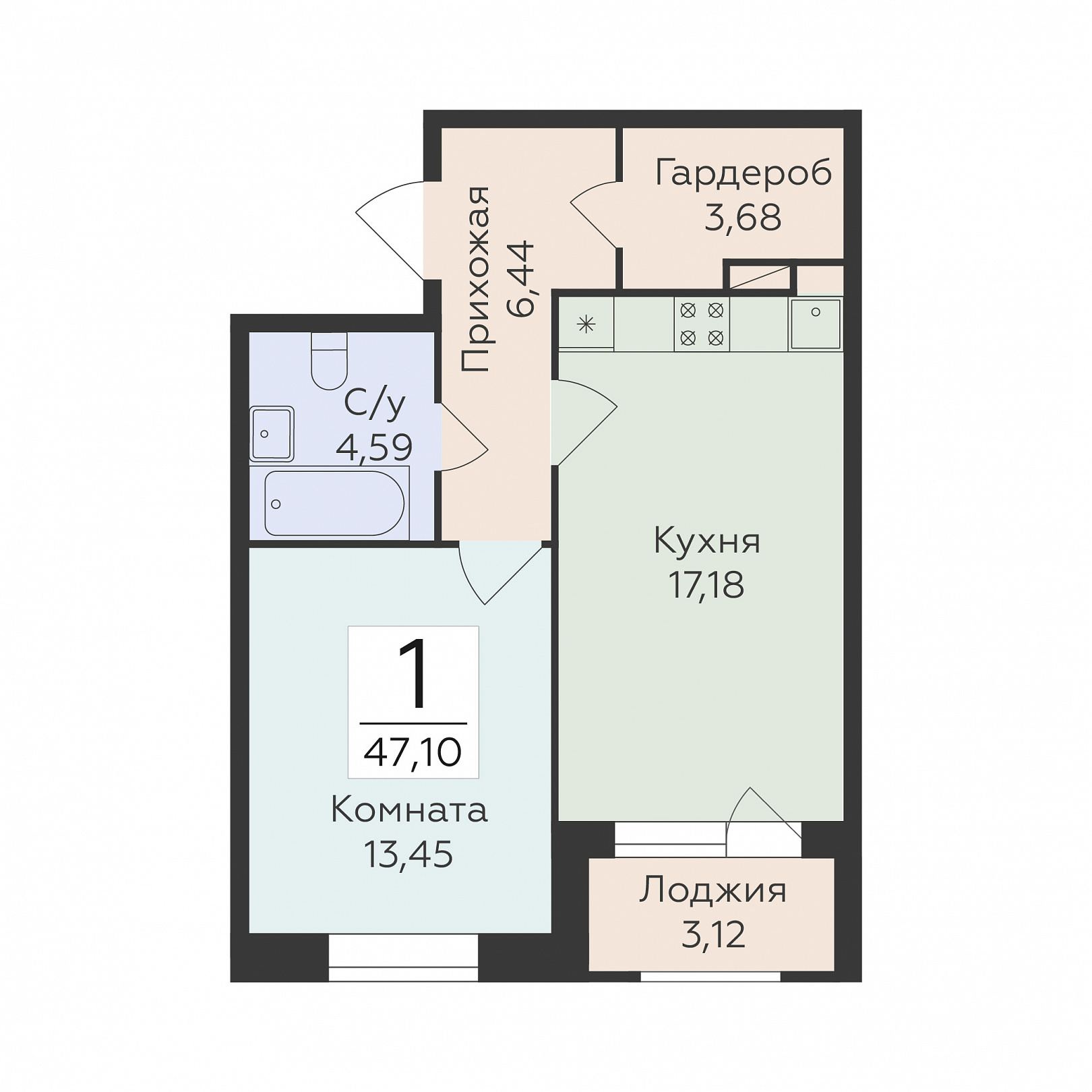 1-комнатная квартира, 47.1 м2, 6 этаж, №104, Суворов сити 2
