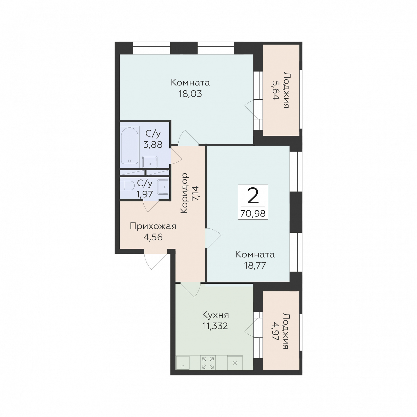 2-комнатная квартира, 70.98 м2, 6 этаж, №294, Суворов сити 2