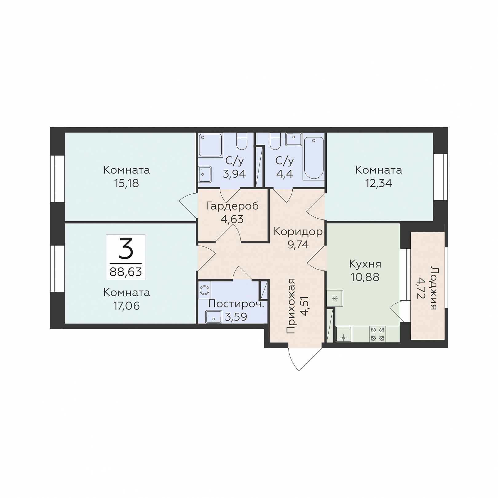 3-комнатная квартира, 88.63 м2, 6 этаж, №102, Суворов сити 2