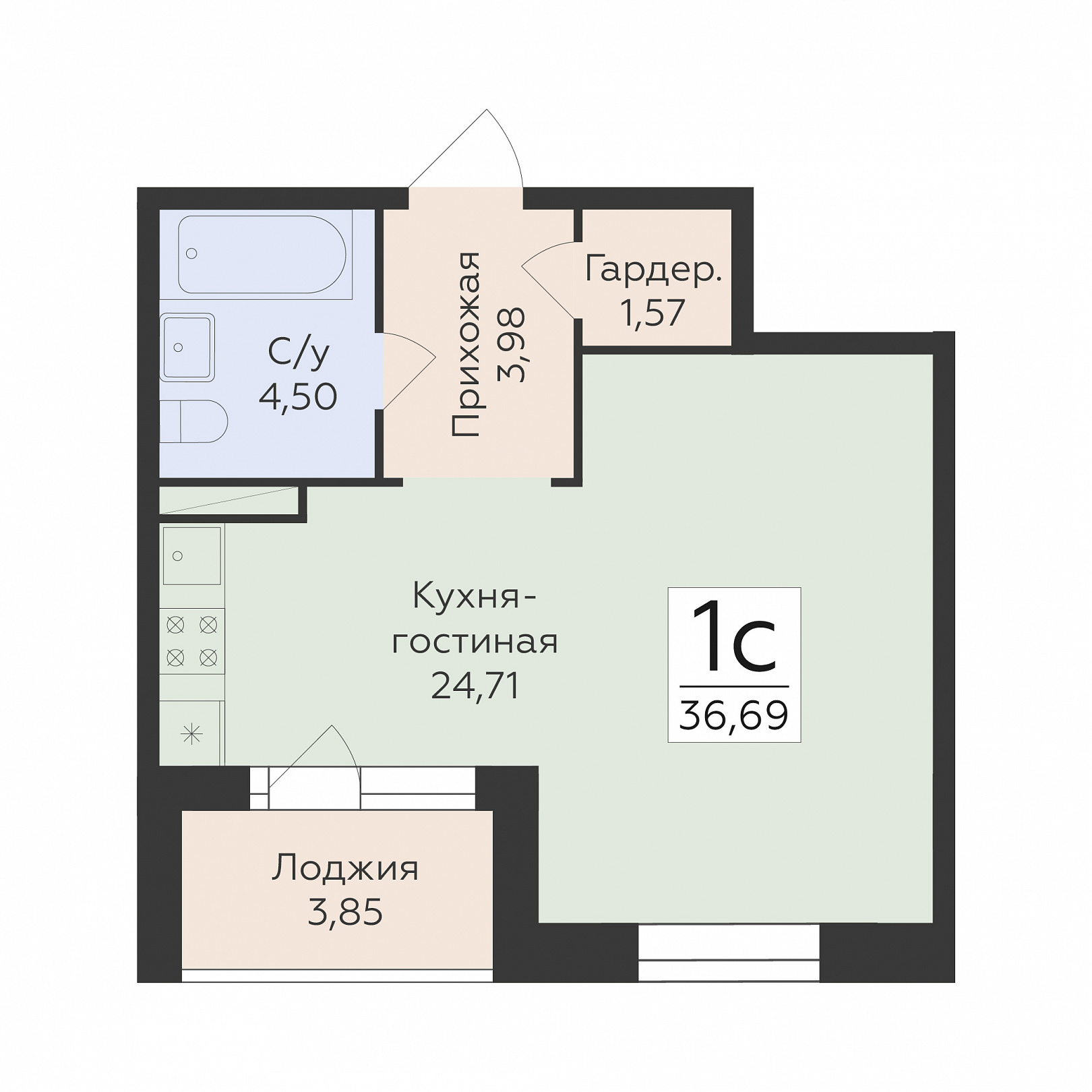 1-комнатная (студия), 39.69 м2, 6 этаж, №444, Суворов сити 2