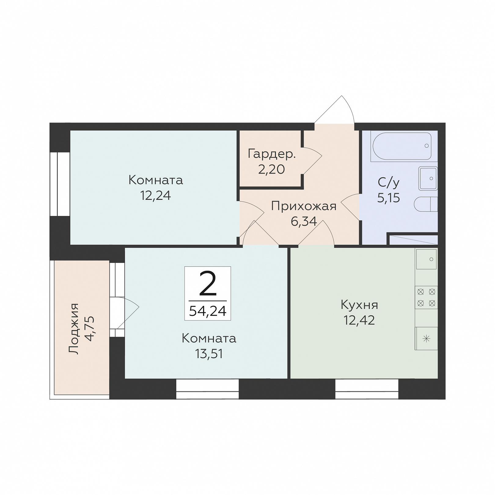 2-комнатная квартира, 54.24 м2, 4 этаж, №437, Суворов сити 2