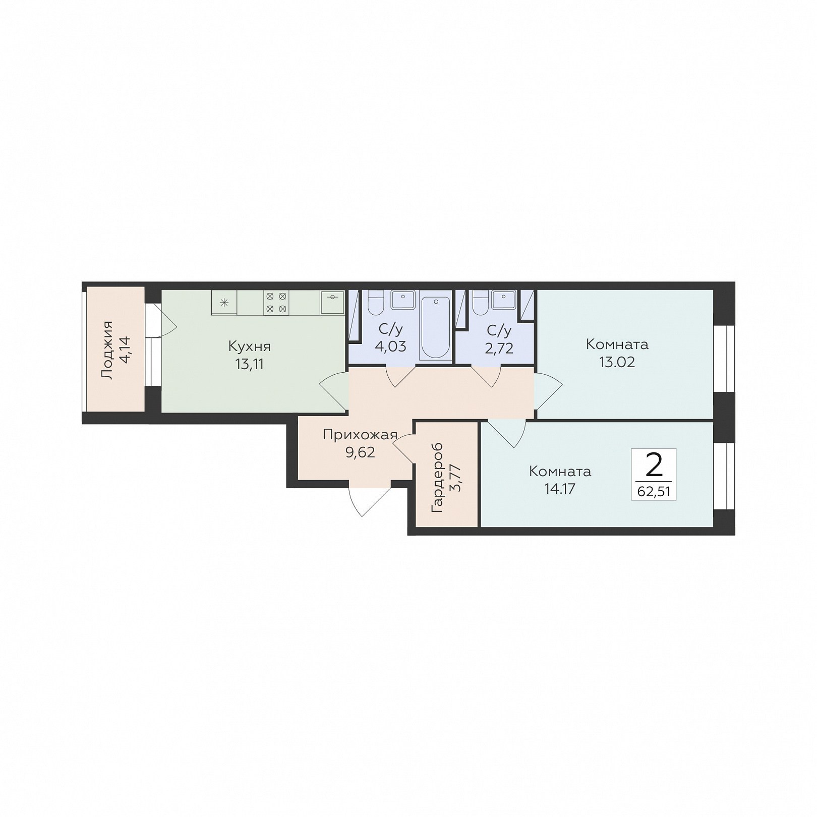 2-комнатная квартира, 62.51 м2, 4 этаж, №378, Суворов сити 2