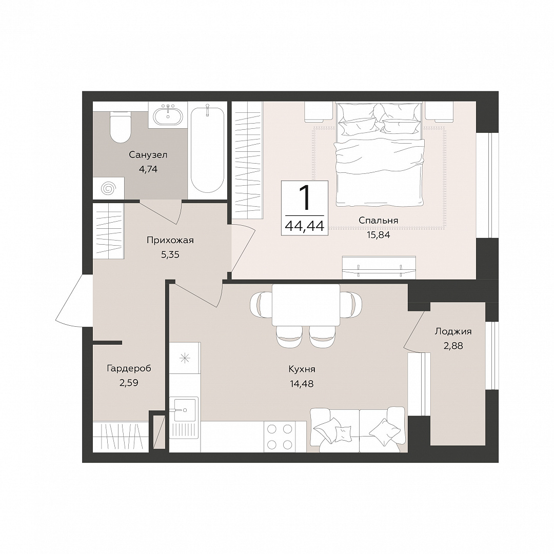 1-комнатная квартира, 44.44 м2, 4 этаж, №24, Эклипс