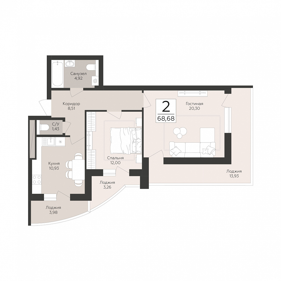 2-комнатная квартира, 68.68 м2, 11 этаж, №83, Скай