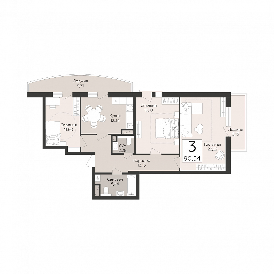 3-комнатная квартира, 90.54 м2, 5 этаж, №35, Скай