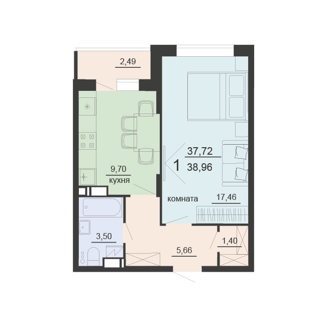 1-комнатная квартира, 38.96 м2, 14 этаж, №151, Чехов