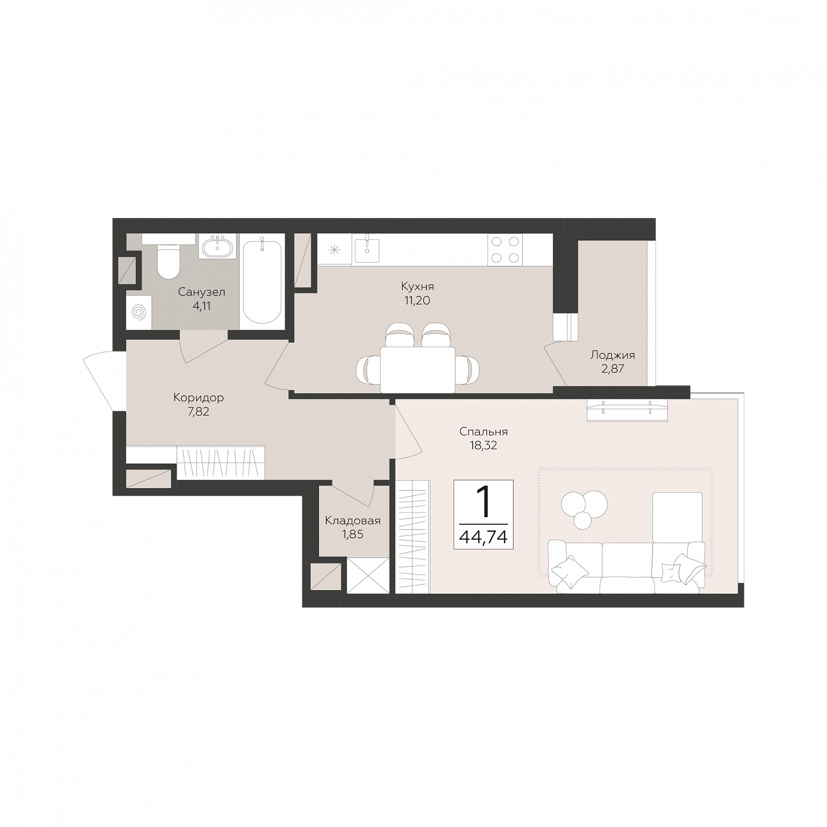 1-комнатная квартира, 44.74 м2, 3 этаж, №10, Скай