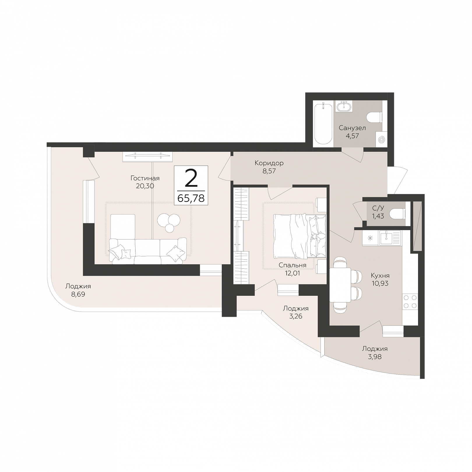 2-комнатная квартира, 65.78 м2, 8 этаж, №57, Скай