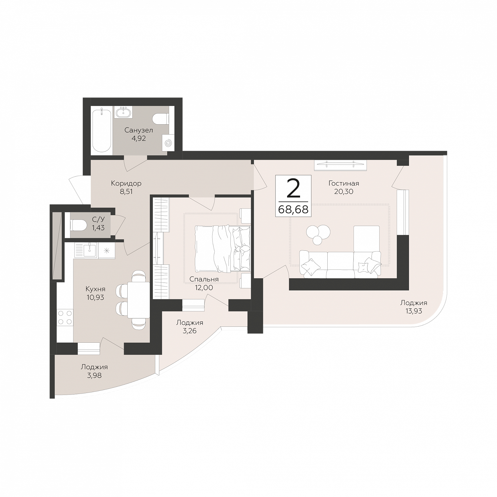 2-комнатная квартира, 68.68 м2, 11 этаж, №83, Скай