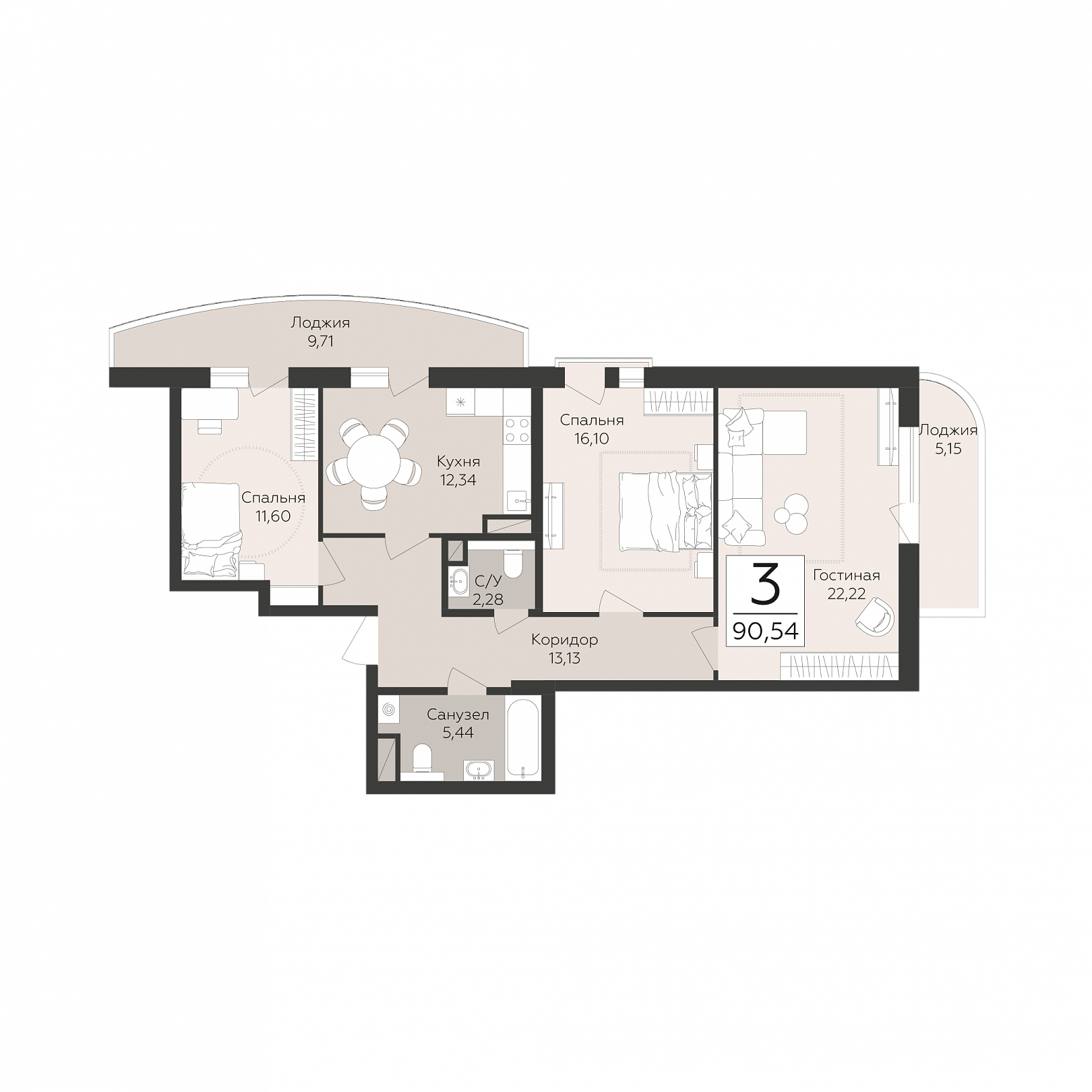 3-комнатная квартира, 90.54 м2, 5 этаж, №35, Скай