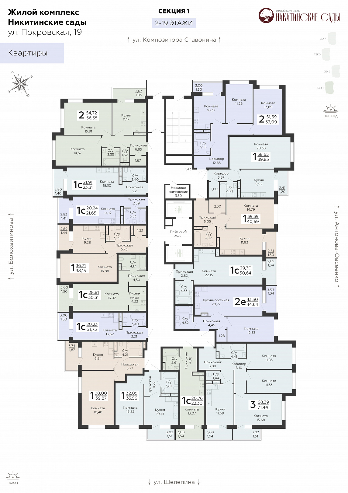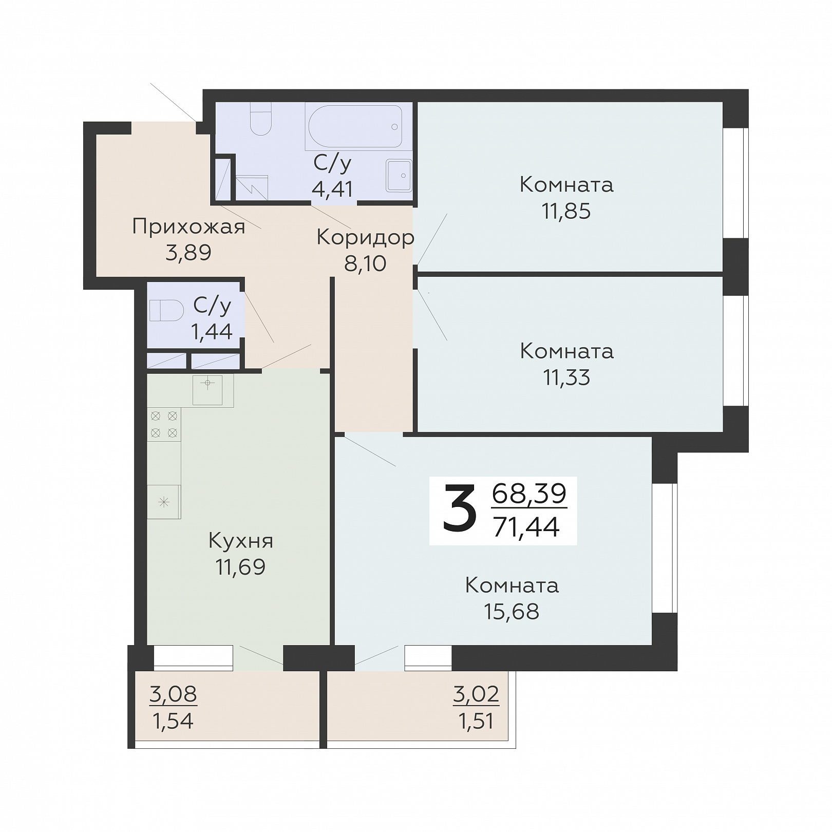 3-комнатная квартира, 71.44 м2, 15 этаж, №201, Никитинские сады