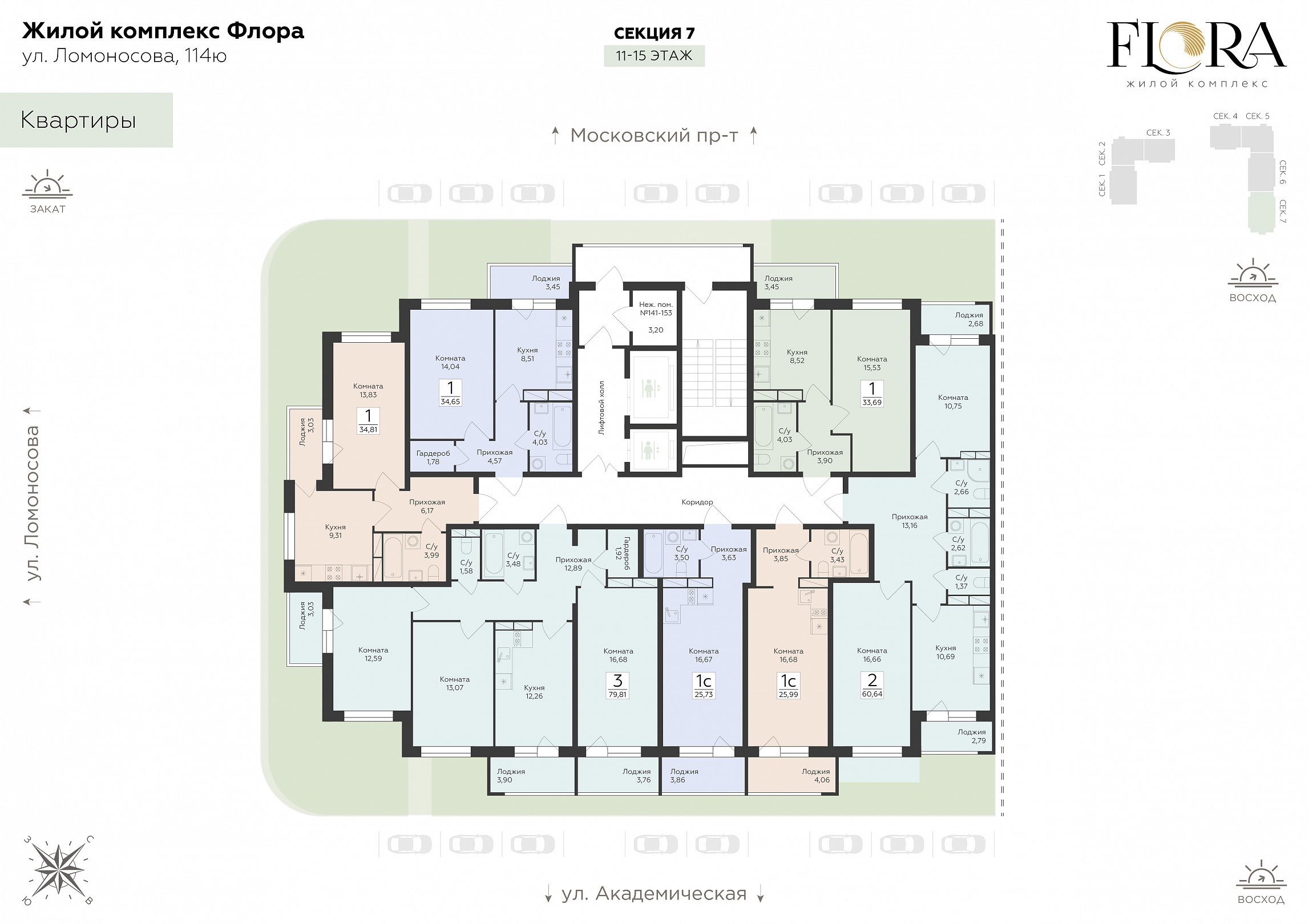 1-комнатная (студия), 25.73 м2, 12 этаж, №713, Flora