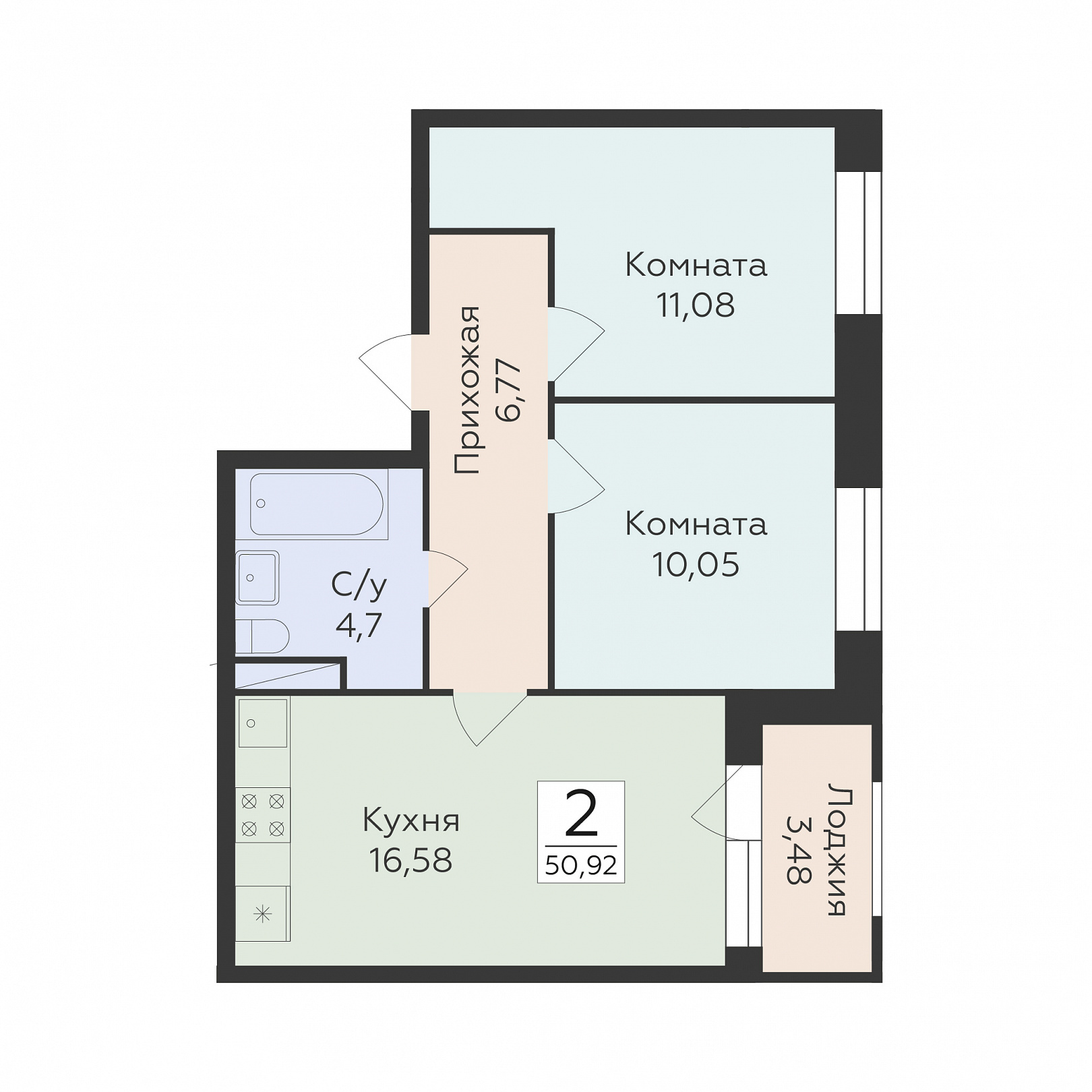 2-комнатная квартира, 50.92 м2, 8 этаж, №47, Суворов сити 2