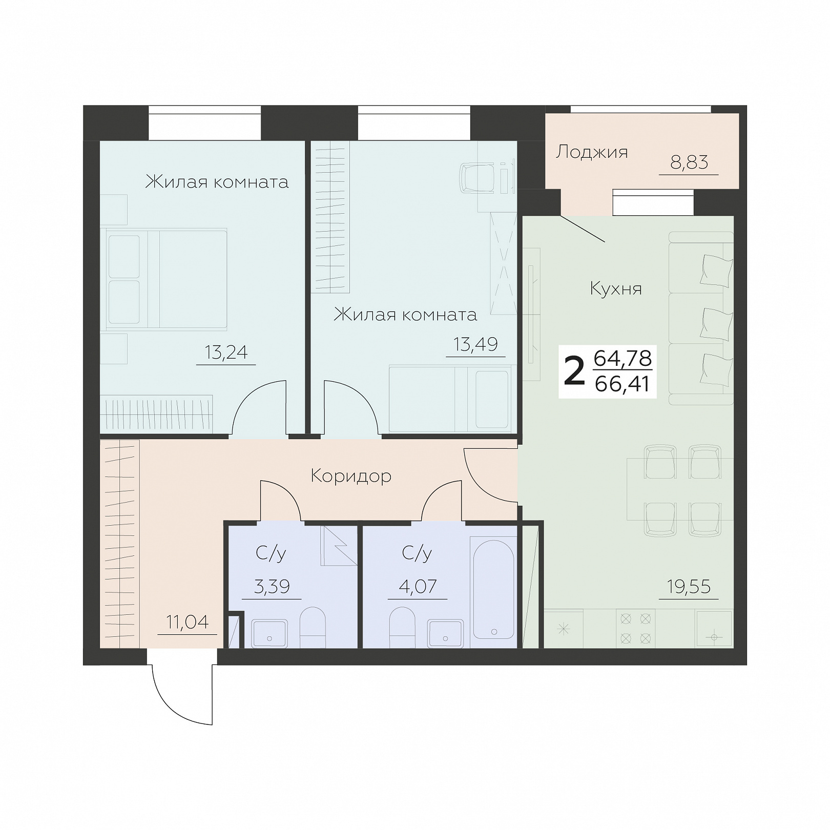 2-комнатная квартира, 66.41 м2, 3 этаж, №518, Заря