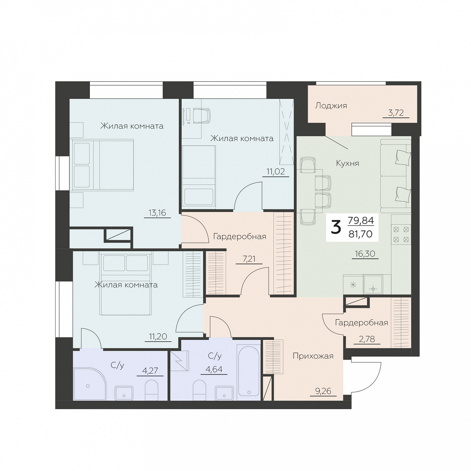 3-комнатная квартира, 81.7 м2, 10 этаж, №1 064, Заря
