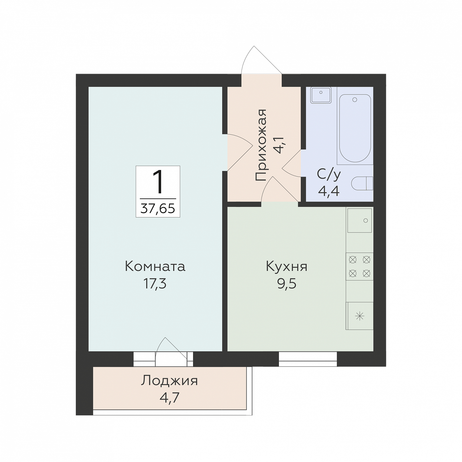 1-комнатная квартира, 37.65 м2, 14 этаж, №268, Классики